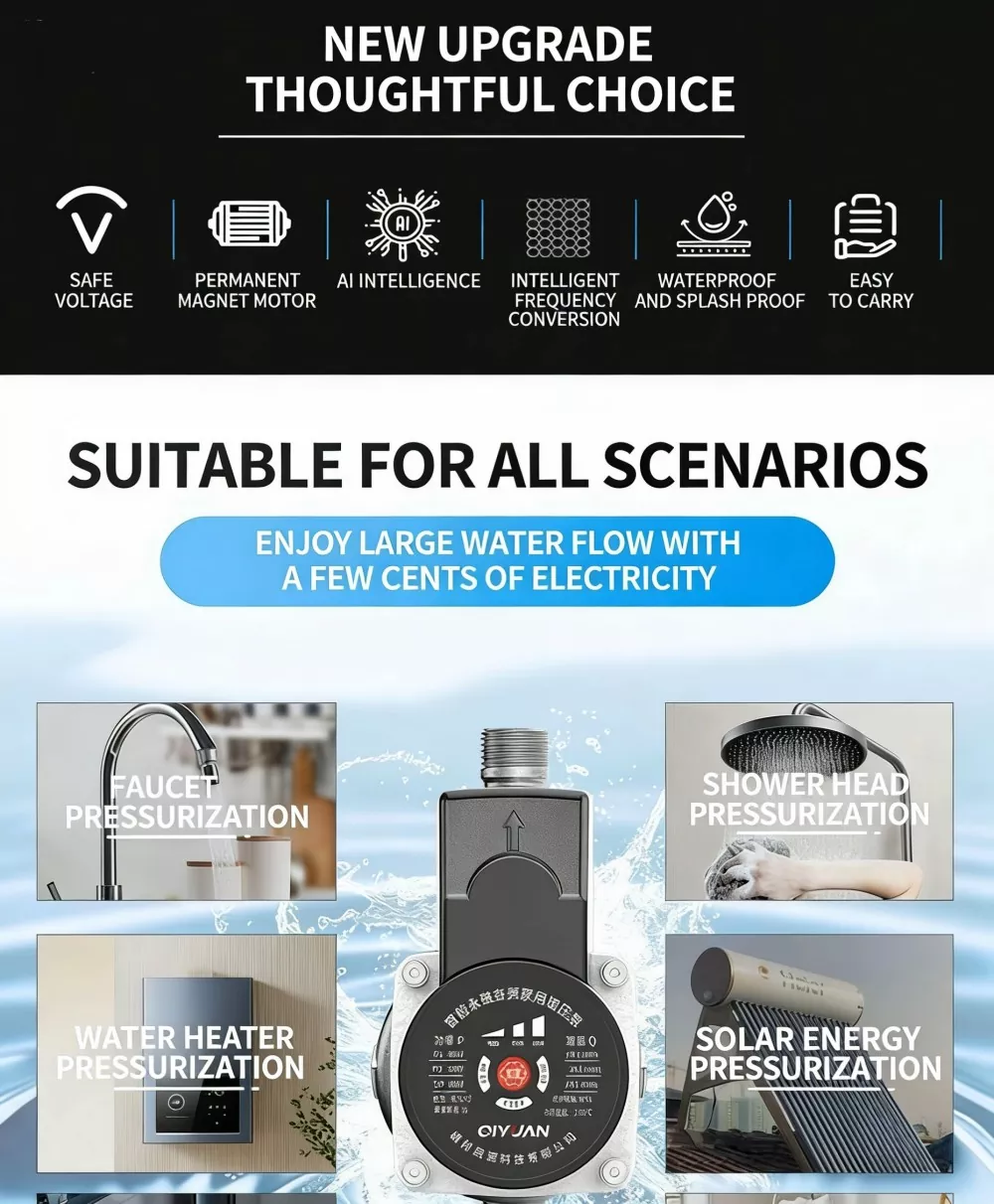 Интеллектуальный бесшумный бустерный насос с постоянным магнитом и регулируемой частотой, предназначенный для различных бытовых проблем, связанных с недостаточным давлением воды, полностью охватывает следующие основные сценарии использования: