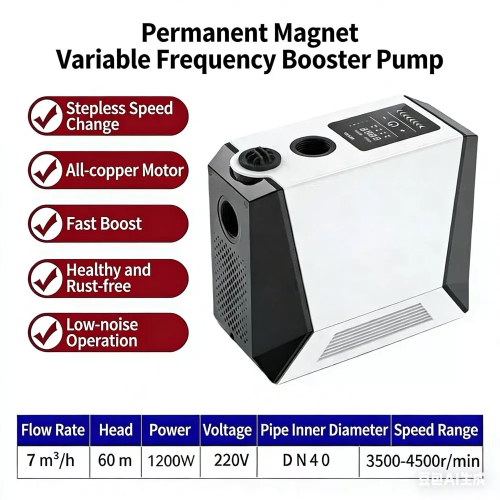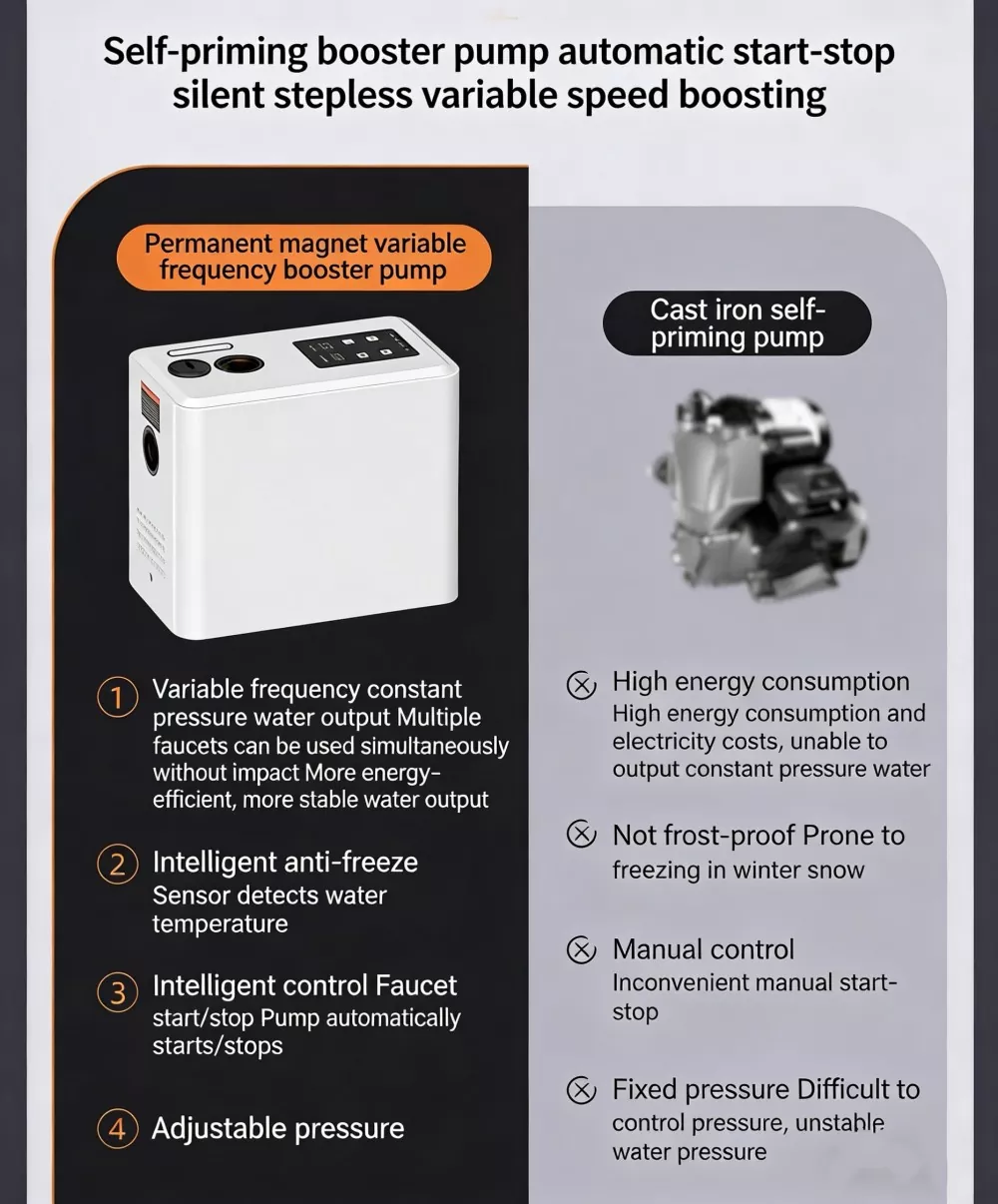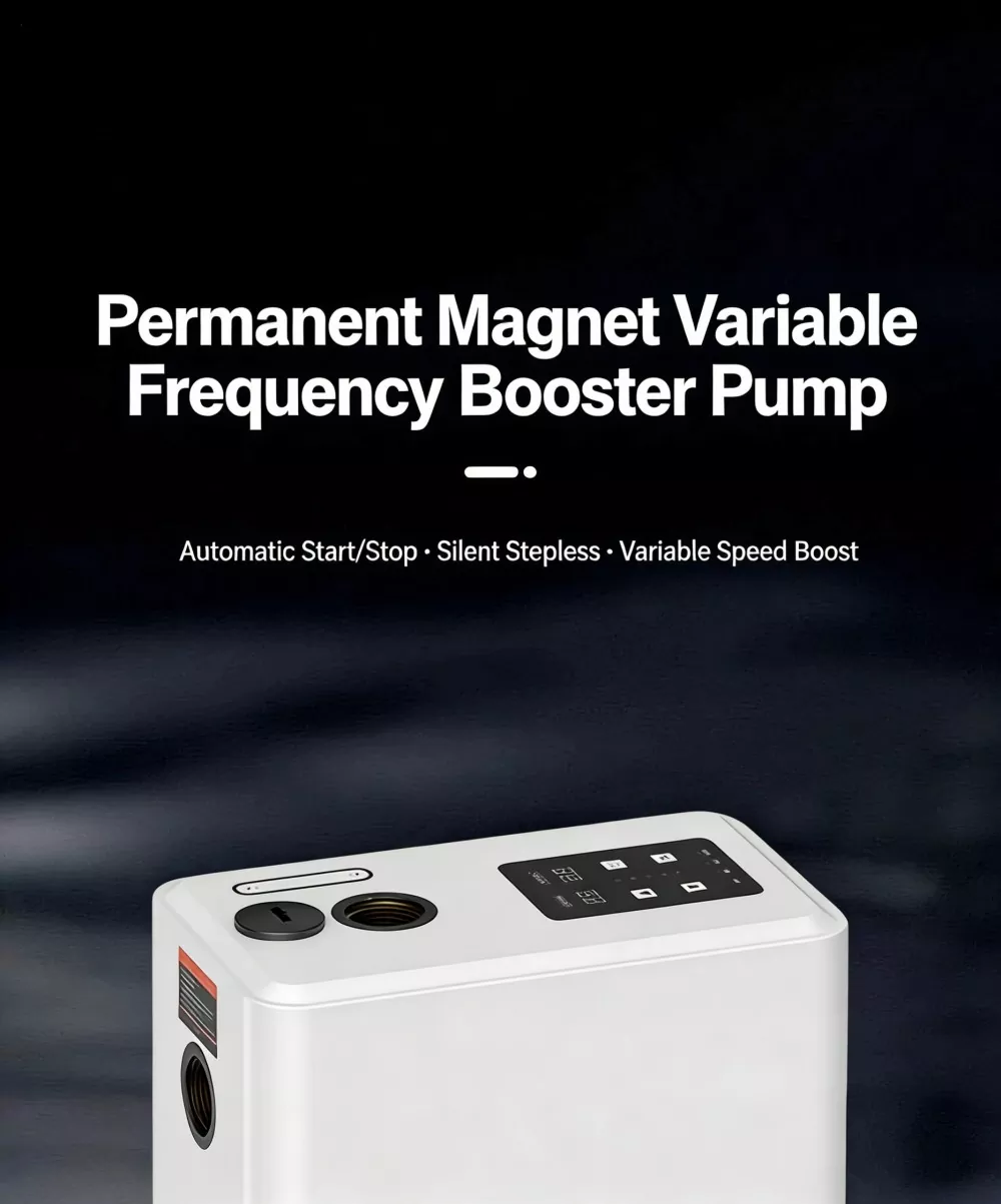 Если вы ищете высококачественное решение для повышения давления бытовой воды, лучшим выбором станет повысительный насос с регулируемой частотой и постоянными магнитами. По сравнению с обычными бустерными насосами, представленными на рынке, наш продукт оснащен полностью интеллектуальной системой управления, стабильной функцией постоянного давления с переменной частотой, сверхнизким уровнем шума, высокоскоростным мощным двигателем, интеллектуальной защитой от замерзания и компактным стильным внешним видом. Он прекрасно устраняет общие недостатки традиционных насосов, такие как громоздкое ручное управление, нестабильное давление воды, высокий рабочий шум, легкое повреждение от замерзания зимой, а также громоздкая и сложная установка.
