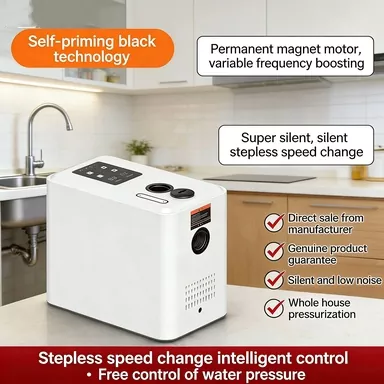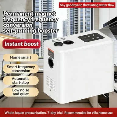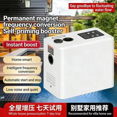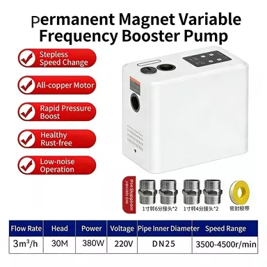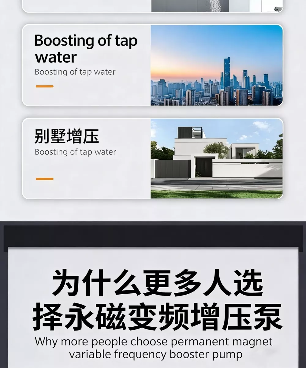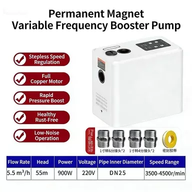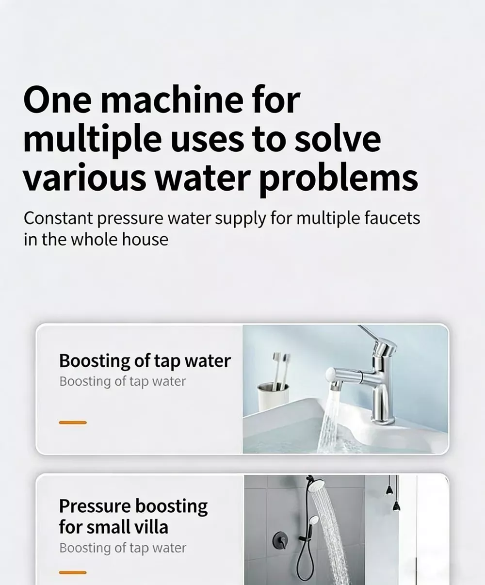 Если вы ищете высококачественное решение для повышения давления бытовой воды, лучшим выбором станет повысительный насос с регулируемой частотой и постоянными магнитами. По сравнению с обычными бустерными насосами, представленными на рынке, наш продукт оснащен полностью интеллектуальной системой управления, стабильной функцией постоянного давления с переменной частотой, сверхнизким уровнем шума, высокоскоростным мощным двигателем, интеллектуальной защитой от замерзания и компактным стильным внешним видом. Он прекрасно устраняет общие недостатки традиционных насосов, такие как громоздкое ручное управление, нестабильное давление воды, высокий рабочий шум, легкое повреждение от замерзания зимой, а также громоздкая и сложная установка.