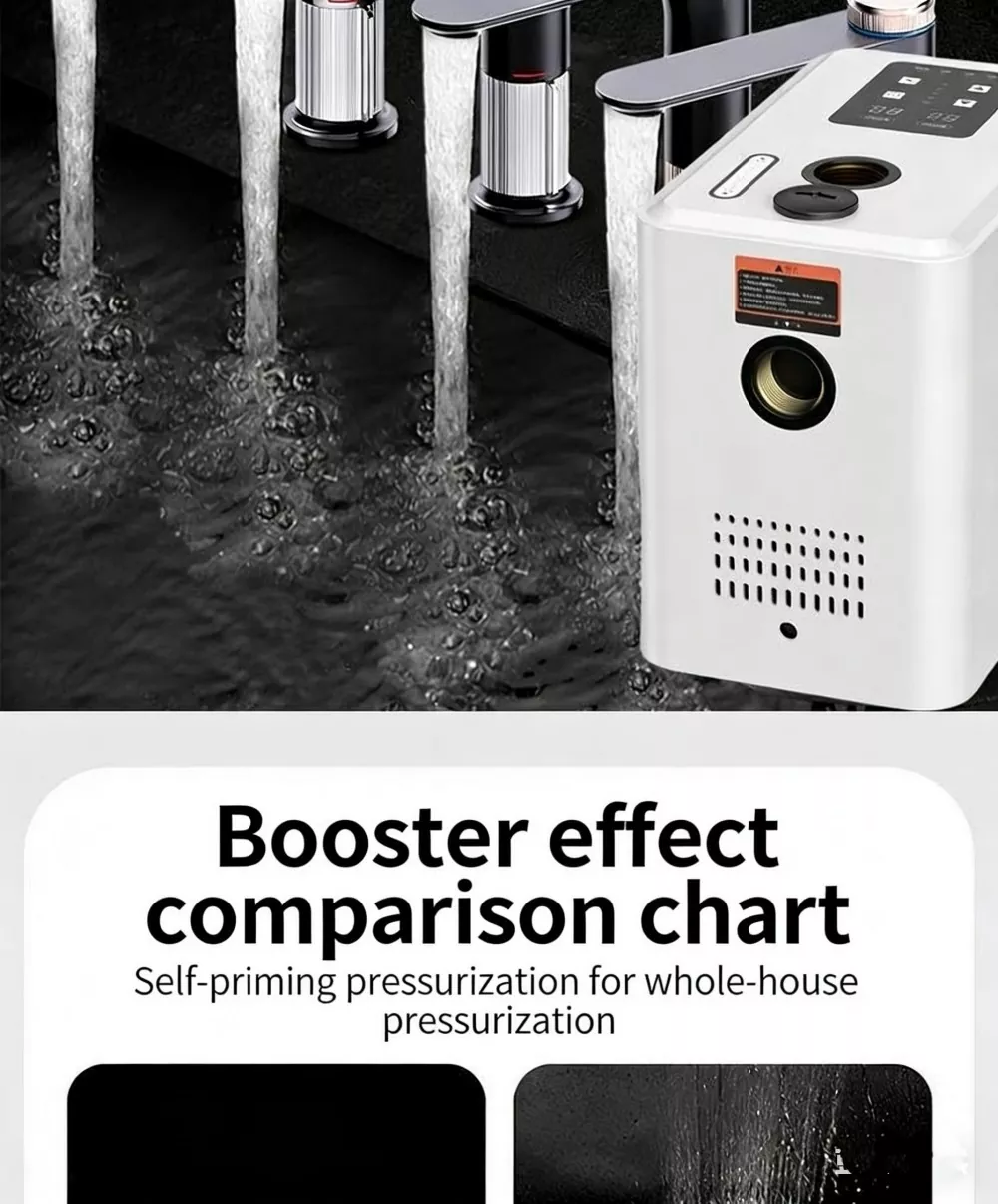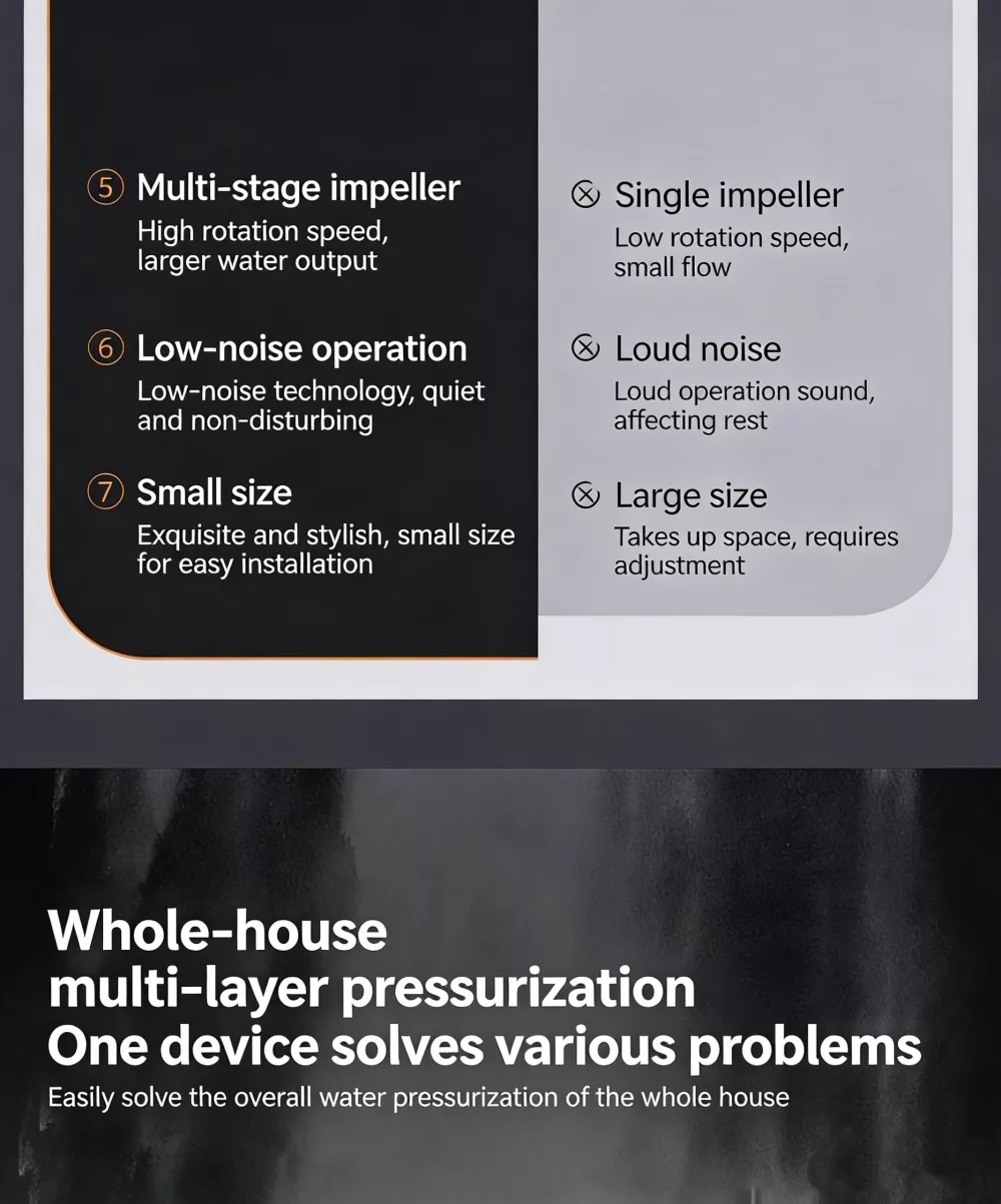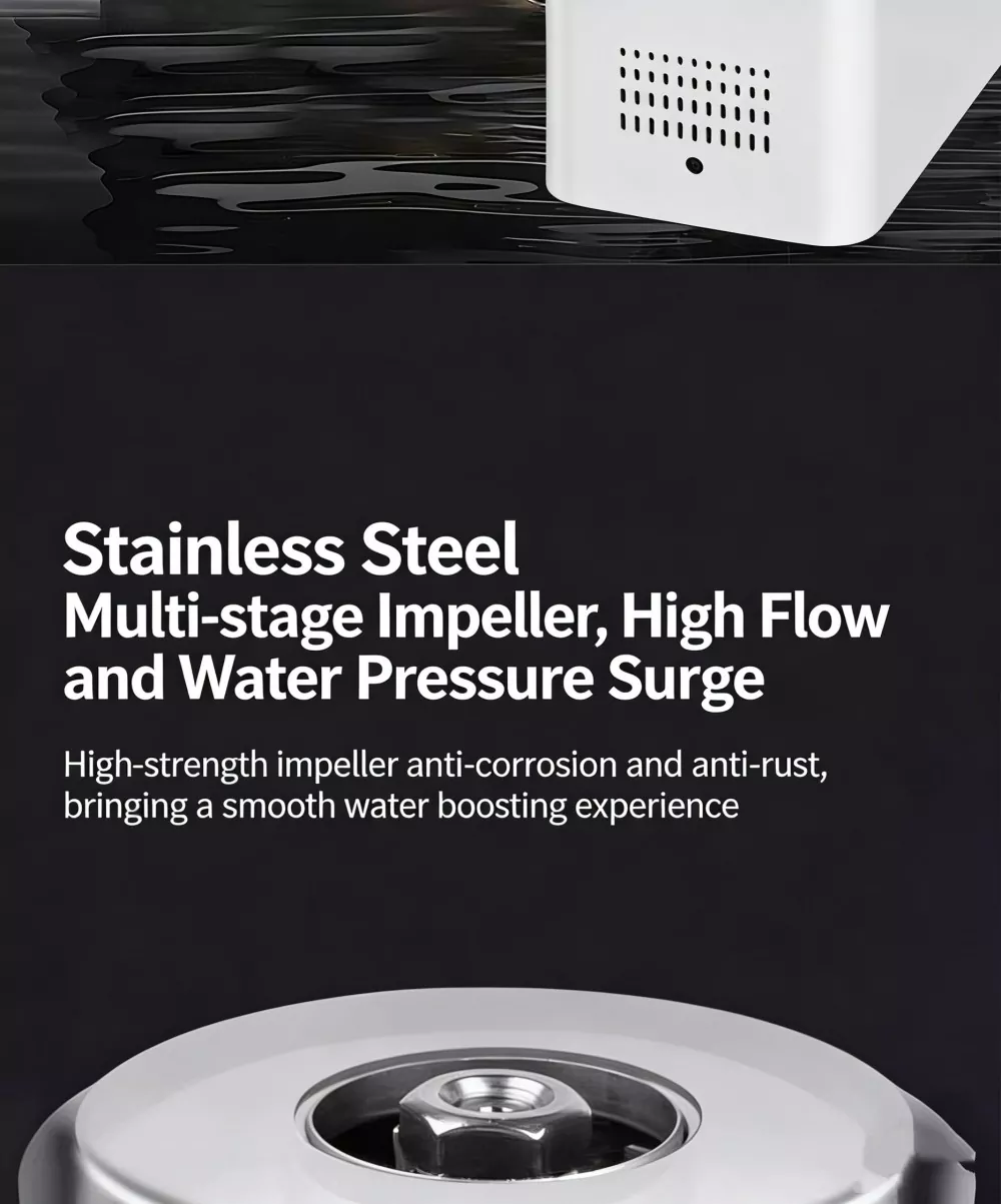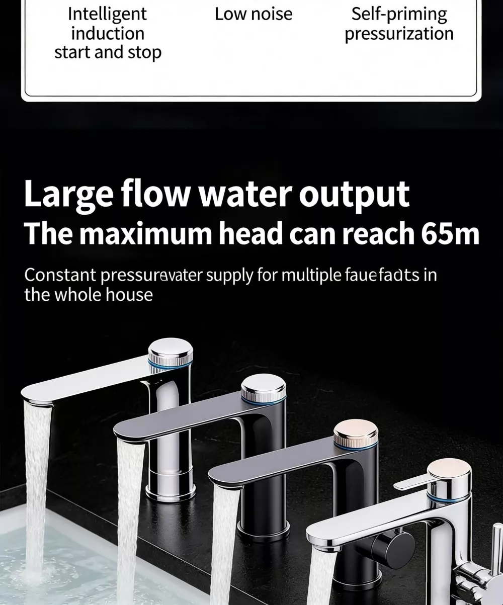 Высокоскоростной двигатель: встроенный высокоскоростной двигатель со скоростью 6500 об/мин обеспечивает импульсную мощность, обеспечивает сильную и стабильную подачу воды с большим расходом и полностью решает проблему недостаточного давления воды в быту.