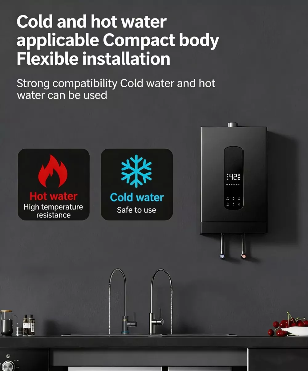 Коррозионностойкий интерфейс: входное и выходное отверстия для воды изготовлены из материала из чистой меди, который обладает отличной коррозионной стойкостью и устойчивостью к ржавчине, долговечен для длительного использования, безопасен и экологичен, а также соответствует стандартам безопасности бытовой питьевой воды.